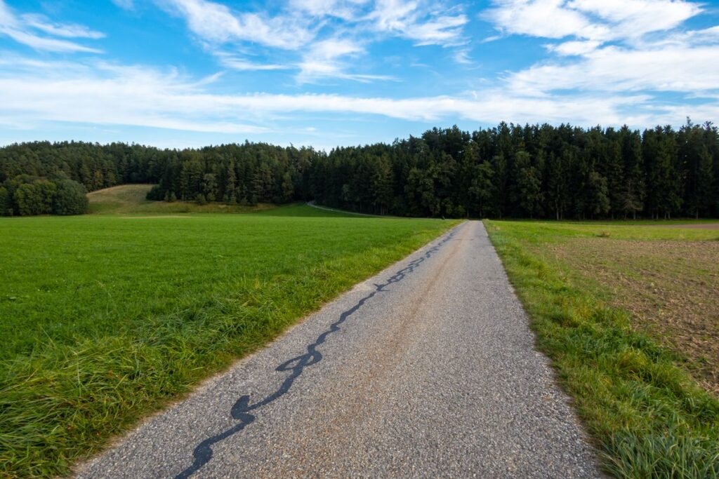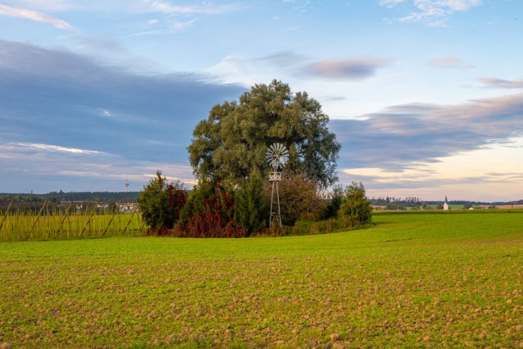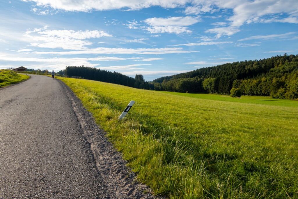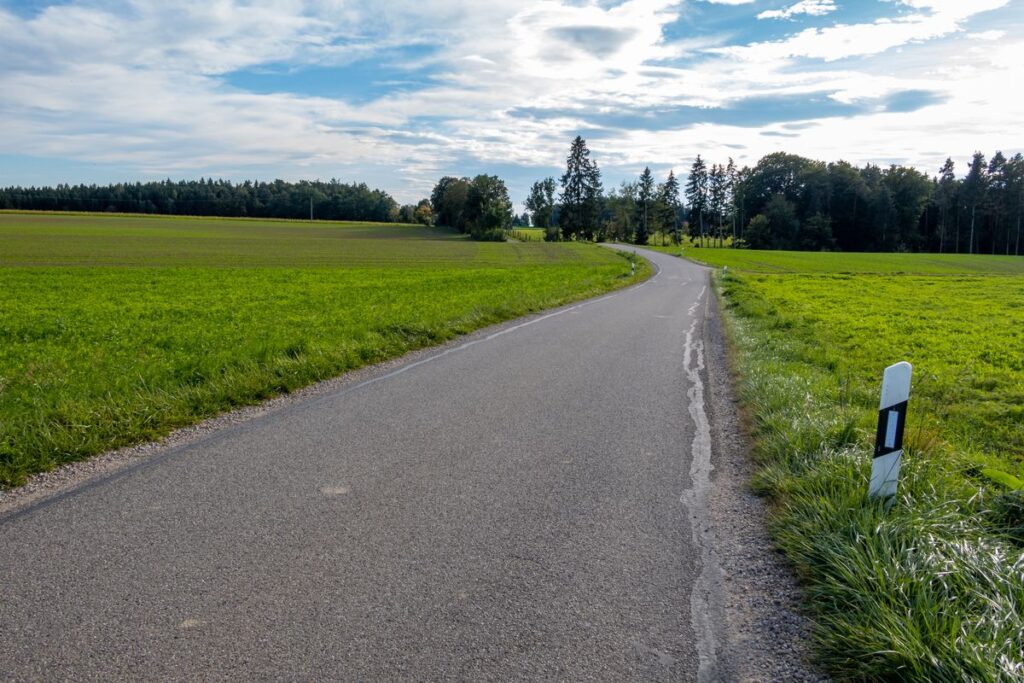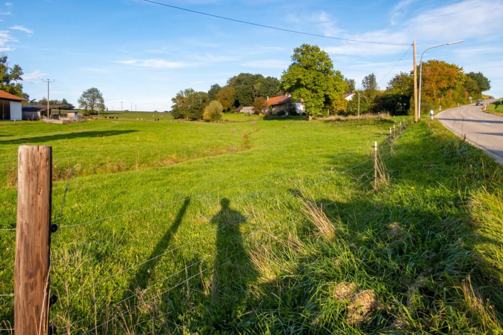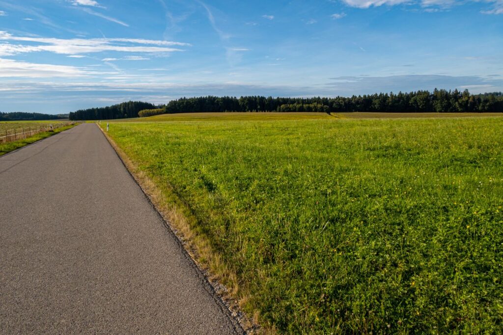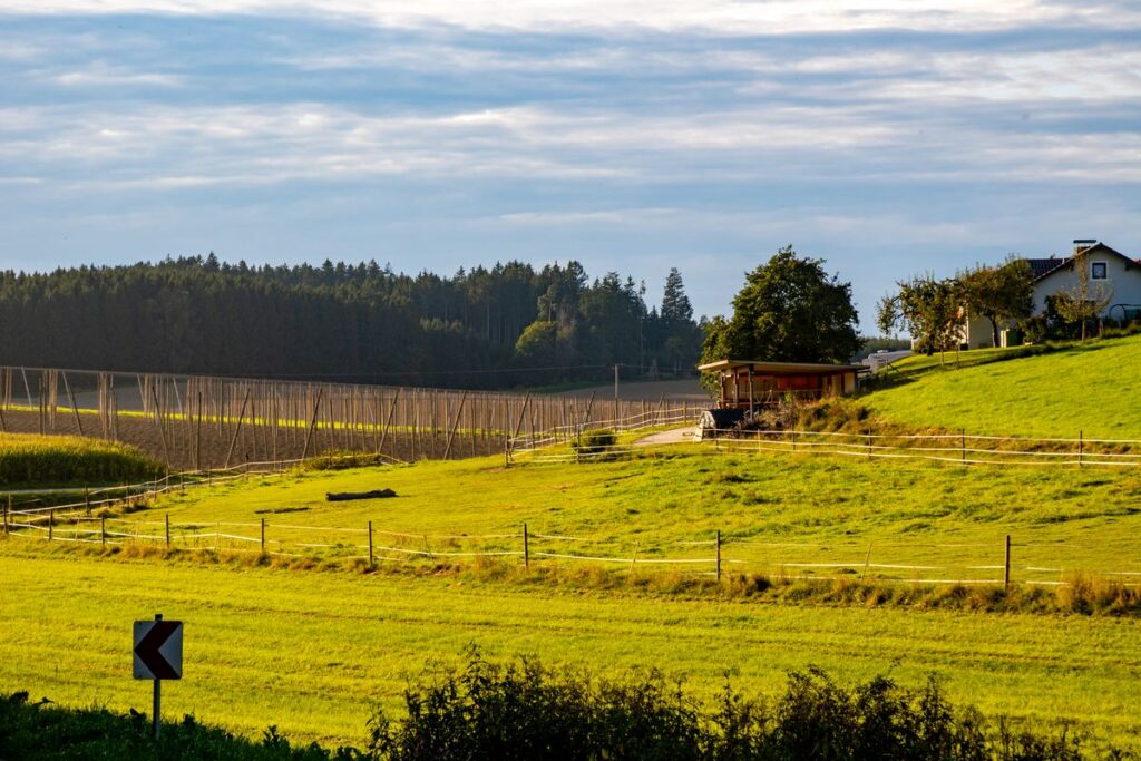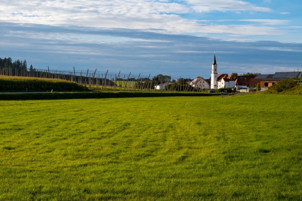 Wir starten am Further Dorfplatz und fahren kurz auf der Staatsstraße Richtung Mainburg um nach der Fußgängerampel links Richtung Edelmannsberg abzubiegen. Wir folgen dem am Dorfende beginnenden Radweg steil bergauf (ein Hoch auf das E-Bike 😉 ), durchqueren Edelmannsberg um abermals auf den Radweg, diesmal aber bergab, zu gelangen. Vorsicht: Der Radweg endet etwas plötzlich auf dem Hang, also langsam fahren. Kurzzeitig begeben wir uns auf die 2-spurige Straße Richtung Attenhausen. Es geht vorbei an Eckenhausen. Aber noch vor Schlagkreut biegen wir links ab Richtung Buchberg. Nun beginnt unsere „Pampa“-Tour der einsamen Dorfverbindungsstraßen so richtig.