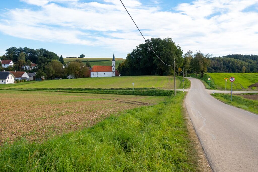 Immer gerade aus bleiben wir auf diesem ruhigen und schön gelegenen Weg, vorbei am Pferdehof Schlott und schließlich durch das kleine Dorf Engelshof mit der malerischen Kapelle St. Laurentius. Nach Engelsdorf beginnt auf der Hochebene einer der schönsten Streckenteile. Im Sommer fährt man hier durch blühende Wiesen. Ohne es zu merken, überqueren wir die Grenze zwischen Niederbayern und Oberbayern und treffen nach einem kurzen Waldstück auf die Straße FS 21. Wir biegen links in diese Straße ein, um sie gleich wieder nach rechts (Landersdorf) zu verlassen. Vorbei an einer Kiesgrube erreichen wir bald eine Kreuzung, welche wir fast geradeaus überqueren.