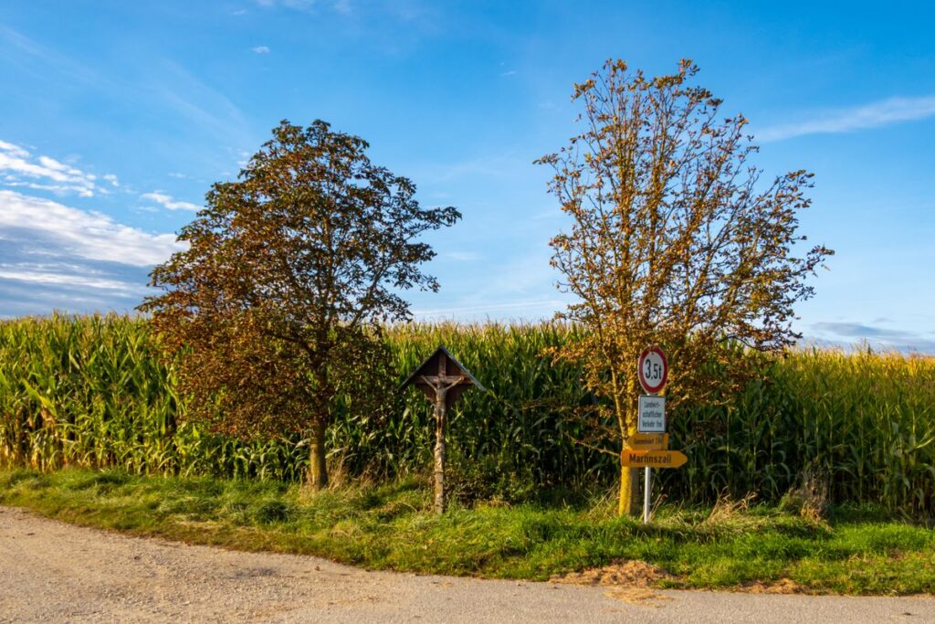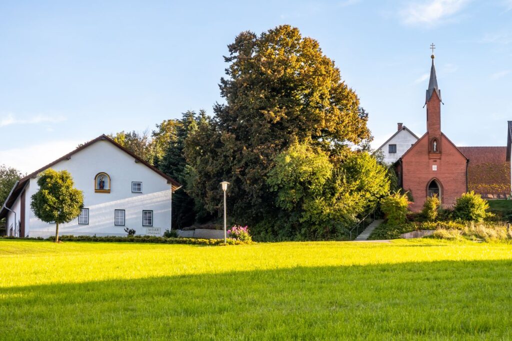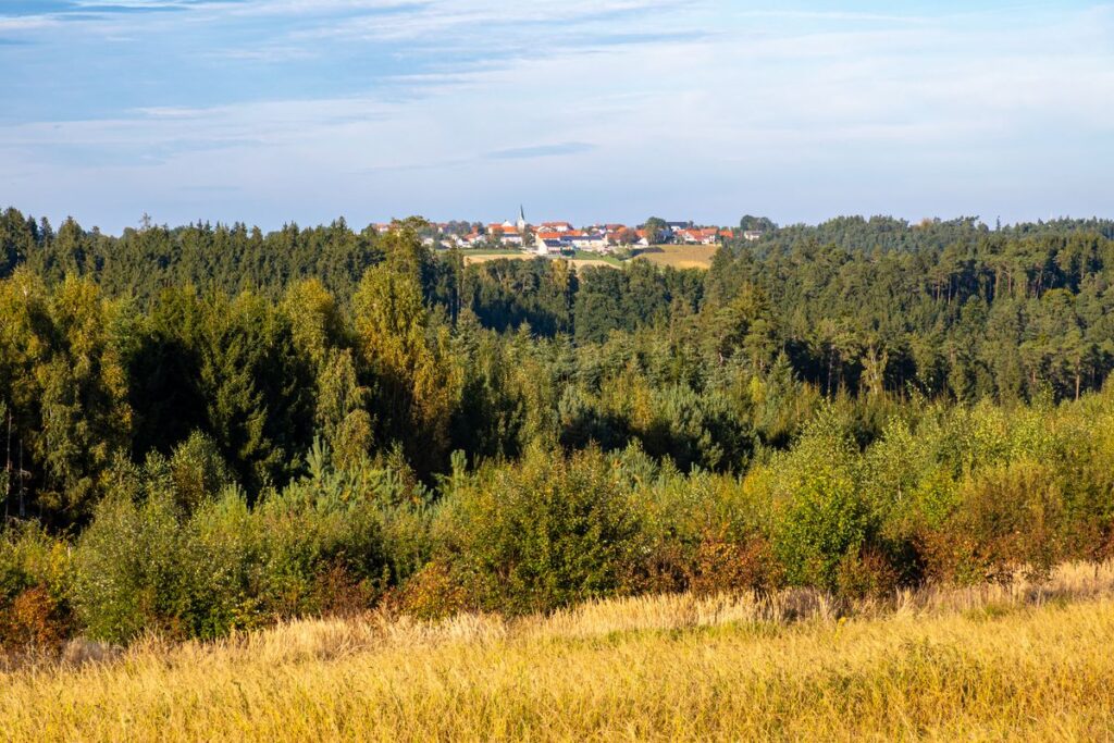 Unser weiterer Weg führt uns nach Rehbach. Hinter Rehbach nehmen wir nach einer länglichen Linkskurve die Abzweigung nach rechts Richtung Priel. In Priel angekommen fahren wir erst am Straßenende rechts um dann gleich die nächste Möglichkeit Richtung Dreifaltern abzubiegen. Wir bleiben stets auf einspurigen Dorfverbindungsstraßen. Dreifaltern durchqueren wir geradeaus und ereichen nach einem weiteren Kilometer Schergenöd und schließlich Berghof. Dort angekommen biegen wir links ab. Nach einer kurzen schlangenlinienförmigen Waldabfahrt erreichen wir schließlich das idyllische Katharinazell und folgen hier einfach der Teerstraße. Am Beginn der Hopfengärten sind wir wieder zurück in Niederbayern und erreichen alsbald die Staatsstraße 2049, welche wir vorsichtig überqueren. Durch Martinszell hindurch führt die Straße nun bergab und wir nehmen den Schwung mit vorbei an Walchzell bis wir schließlich das Straßenende erreichen und rechts abbiegen um durch Zieglreuth zu fahren. Bei Reitersberg biegen wir nach rechts ab um Richtung Freyung / Obermünchen abzukürzen, begeben uns dadurch allerdings kurz auf einen gut befahrbaren Schotterweg. Wer komplett auf Asphalt bleiben möchte, bleibt bei Reitersberg auf der Straße nach Obersüßbach und nimmt anschließend die langezogene Steigung von Obersüßbach hoch nach Freyung in Kauf. Egal auf welcher Route man nach Freyung kommt, die Bank bei der Kapelle Maria Himmelfahrt lädt zu einer kurzen Rast ein.