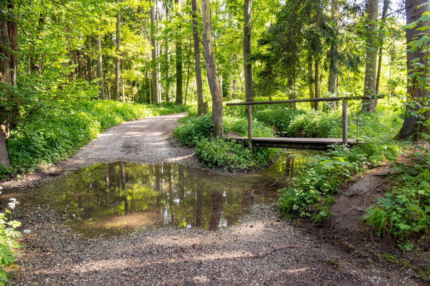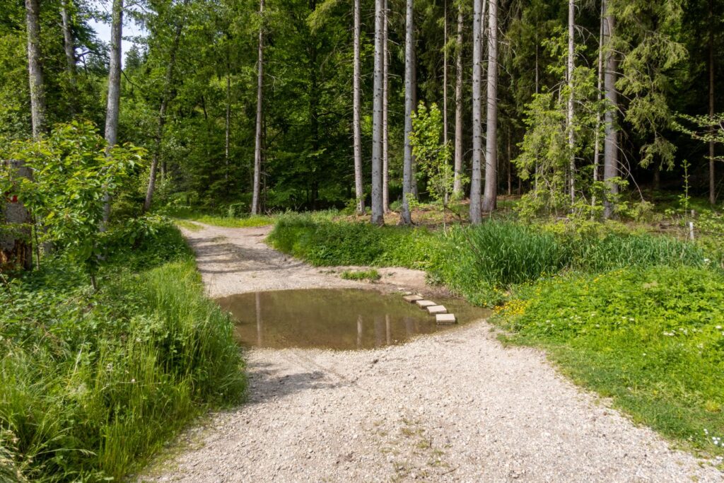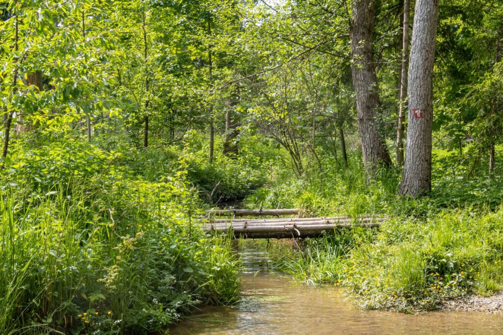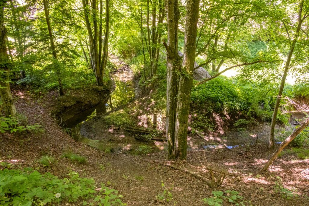 Nach dem steil nach unten führenden Waldweg kommen wir bald auf die Lichtung des Bucher Grabens, welchen wir zunächst überqueren und dann auf der anderen Bachseite parallel durch den Wald folgen. Nach längerem Regen kann es hier recht feucht sein, aber Trampelpfade helfen dann, den matschigen Hauptweg gut zu umgehen. Nach dem kurzen Waldstück genießen wir die Sonne und den freien Blick über die Wiesen des Bucher Grabens. Auf einem ggf. etwas hoch bewachsenen Wiesenweg geht es für uns weiter gerade aus. Der Wald links und rechts von uns weist uns mittig den Weg. Wir treffen auf einen gut geschotterten Forstweg, welchem wir ein kurzes Stück folgen. Auf einer T-Kreuzung im Wald dürfen wir die Abzweigung nach links (gut sichtbar beschildert mit der weißen Eins auf rotem Grund) nicht verfehlen. Nun geht es direkt durch das Bachbett. In dieser Furt heißt es entweder auf den Steinen entlang hüpfen oder die Schuhe ausziehen und seinen Füßen eine kurze Abkühlung gönnen.