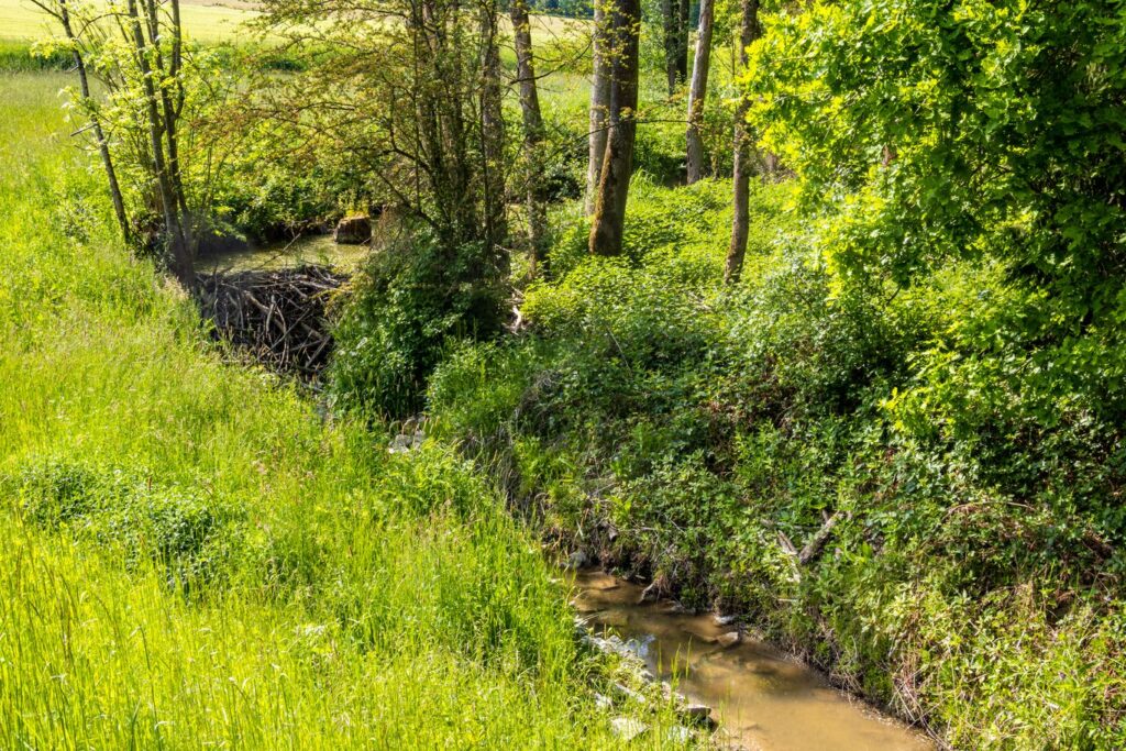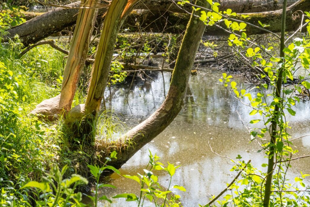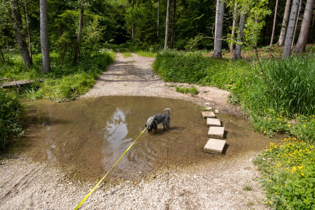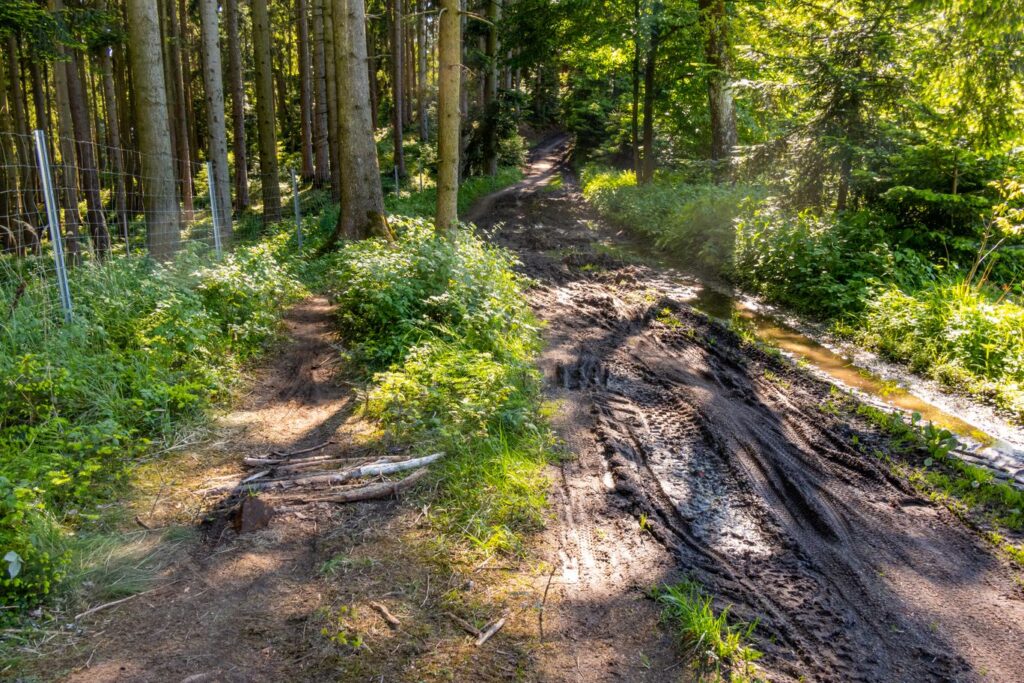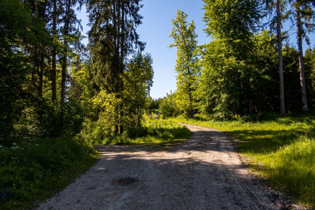 Nach dem steil nach unten führenden Waldweg kommen wir bald auf die Lichtung des Bucher Grabens, welchen wir zunächst überqueren und dann auf der anderen Bachseite parallel durch den Wald folgen. Nach längerem Regen kann es hier recht feucht sein, aber Trampelpfade helfen dann, den matschigen Hauptweg gut zu umgehen. Nach dem kurzen Waldstück genießen wir die Sonne und den freien Blick über die Wiesen des Bucher Grabens. Auf einem ggf. etwas hoch bewachsenen Wiesenweg geht es für uns weiter gerade aus. Der Wald links und rechts von uns weist uns mittig den Weg. Wir treffen auf einen gut geschotterten Forstweg, welchem wir ein kurzes Stück folgen. Auf einer T-Kreuzung im Wald dürfen wir die Abzweigung nach links (gut sichtbar beschildert mit der weißen Eins auf rotem Grund) nicht verfehlen. Nun geht es direkt durch das Bachbett. In dieser Furt heißt es entweder auf den Steinen entlang hüpfen oder die Schuhe ausziehen und seinen Füßen eine kurze Abkühlung gönnen.