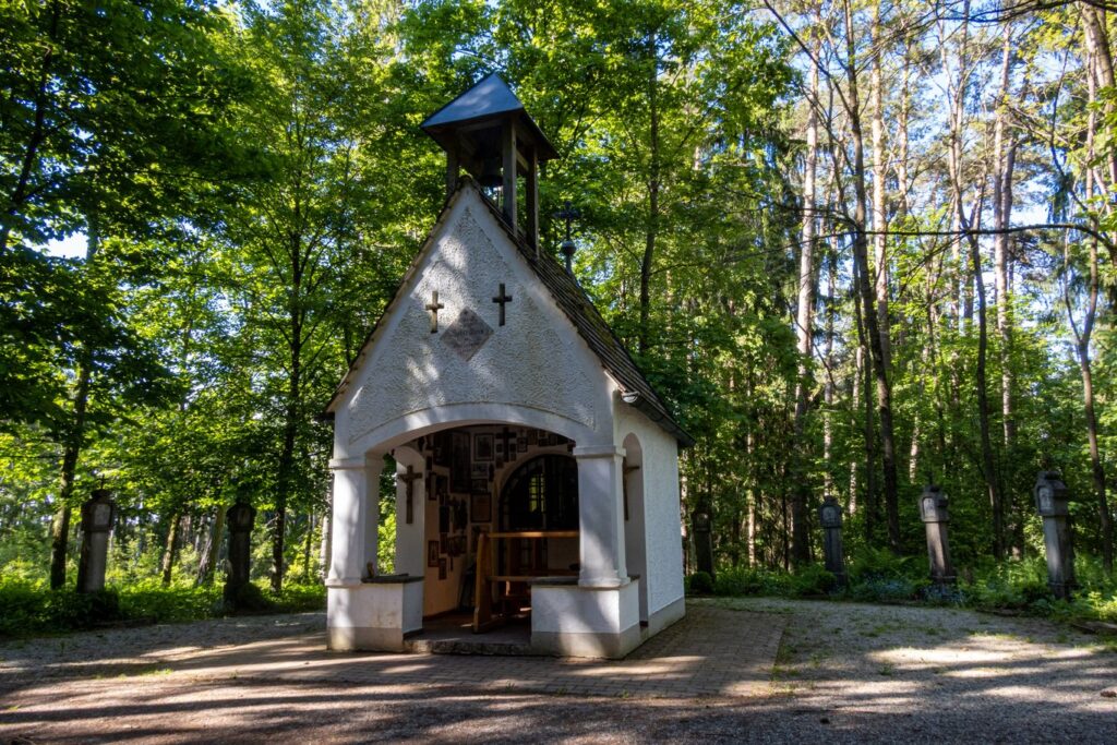 Gleich nach der Überquerung halten wir uns zweimal rechts um dann leicht oberhalb dem Bachbett lange parallel zu folgen. Immer tun sich herrliche Blicke auf den natürlich geschwungenen Bach auf. Auch mehrere beeindruckenden Biberburgen verändern den Bach immer wieder. Lange folgen wir diesem meist breit angelegten Weg, der nur ein kurzes Stück etwas enger wird. Zwei herrlich gelegene Sitzbänke laden auf den folgenden 5 Kilometern zu einer Rast ein. Etwa in der Mitte dieses Wegabschnittes kommen wir an eine weitere Furt, welche wir zwar gerne zur Abkühlung nutzen, aber nicht überqueren. Wir bleiben noch eine ganze Zeit links vom Bachbett, stets der Beschilderung folgend, bis der Weg schließlich aus dem Wald herausführt. Der weiterführende Wiesenweg ist meist so überwuchert, dass wir auch hier der Empfehlung der Beschilderung folgen und über eine Schotterstraße nun den Bach überqueren und nach der Brücke nach links folgen. Der sonnige Wegabschnitt über die Schotterpiste führt uns bis zur Teerstraße. Auf diese biegen wir nach links ein und folgen ihr unter der Autobahn A 92 hindurch bis zu den Tennisplätzen. Um schnell der doch häufiger befahrenen Straße wieder zu entkommen, biegen wir kurze Zeit nach den Tennisplätzen nach links ab in den Höhenweg, welchem wir bis zu unserem Einkehrpunkt folgen: der Tafernwirtschaft Schwaiger in Eugenbach (Öffnungszeiten beachten!). Frisch gestärkt treten wir den Rückweg an. Wir marschieren kurz ein Stück des Höhenwegs zurück und biegen dann nach rechts in den Kirchweg ein. Eine steil ansteigende Treppe führt uns bis hinauf zur Kirche St. Georg, wo wir uns gleich wieder eine Trinkpause verdient haben und herrliche Blicke genießen. Am Parkplatz der Kirche halten wir uns stets links und folgen dem Feldweg. Bei klarer Sicht lohnt ein Blick zurück, der manchmal bis in die Alpen reicht. Kurz geht es weiter durch den Wald, dann entlang des Waldrands. Wir folgen stets dem breiten Weg, welcher uns dieses Mal über die Autobahn führt. Nach der Autobahn nehmen wir an der T-Kreuzung den Weg nach links und folgen weiter der Beschilderung der weißen Eins auf rotem Grund. Der Heimweg geht stets der Beschilderung folgend fast durchgehend auf dem Bergrücken durch den Wald. An diversen Abzweigungen können wir uns dank der guten Beschilderung kaum verlaufen. Kurz vor der Kiesgrube tut sich ein schöner Blick ins Tal des Further Bachs bis nach Arth auf. Wir wandern weiter und treffen schließlich auf die Further Waldkapelle. An der Kapelle zweigt sich der Weg. Wir nehmen die Möglichkeit halblinks und sind nach einem kurzen Abschnitt wieder am Ausgangspunkt angekommen.